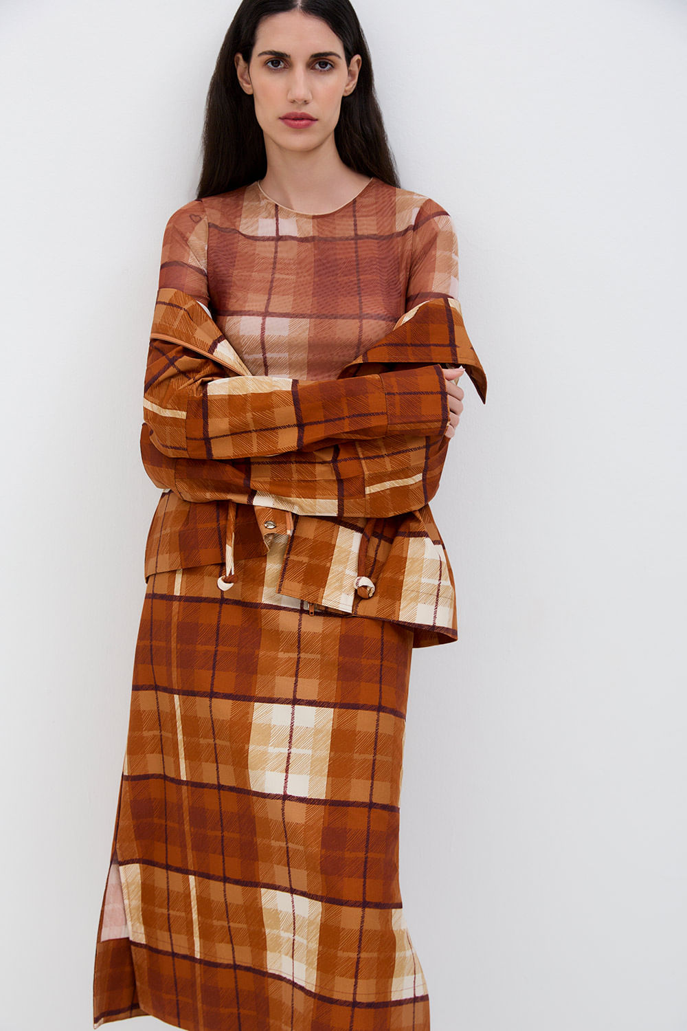 Com modelagem ajustada e mangas longas, a blusa de tule traz leveza e delicadeza à silhueta. O decote careca mantém o visual elegante e atemporal, enquanto o tecido translúcido cria um efeito sutil de transparência. A peça é forrada, garantindo conforto e melhor acabamento ao vestir.