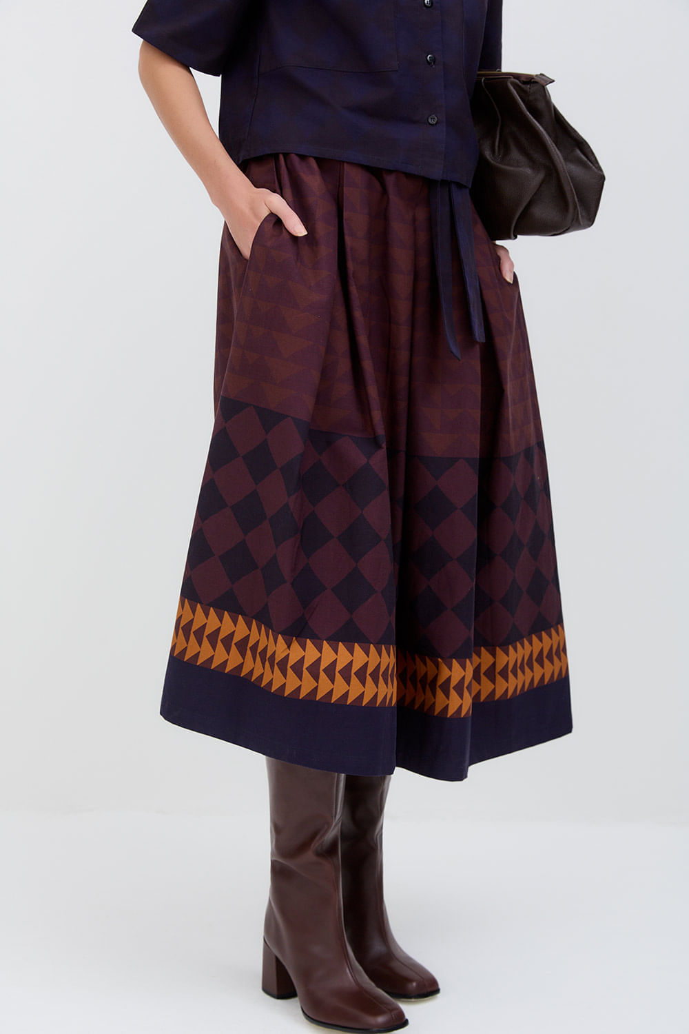 Nossa modelagem best-seller. A saia elástico possui elegância natural, com pregas que criam movimento e leveza ao caminhar. O cós com elástico e passadores garante conforto absoluto, enquanto a faixa do próprio tecido permite amarração em laço e ajuste delicado da cintura. Os bolsos laterais invisíveis, escondidos nas pregas, complementam o design com praticidade. Tecido 100% algodão em estampa exclusiva EMI, desenvolvida manualmente.