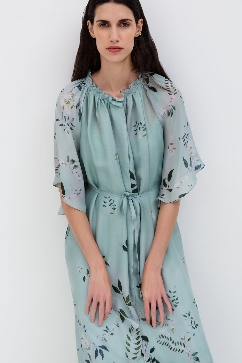 Com comprimento midi e mangas amplas, o vestido bata apresenta um visual leve e sofisticado. A gola careca franzida adiciona delicadeza ao design, enquanto o fecho na gola e a amarração na cintura permitem ajustar o caimento com suavidade. A peça acompanha forro, garantindo conforto e melhor estrutura ao vestir.Tecido 74% viscose 26% seda em estampa exclusiva EMI, desenvolvida manualmente.