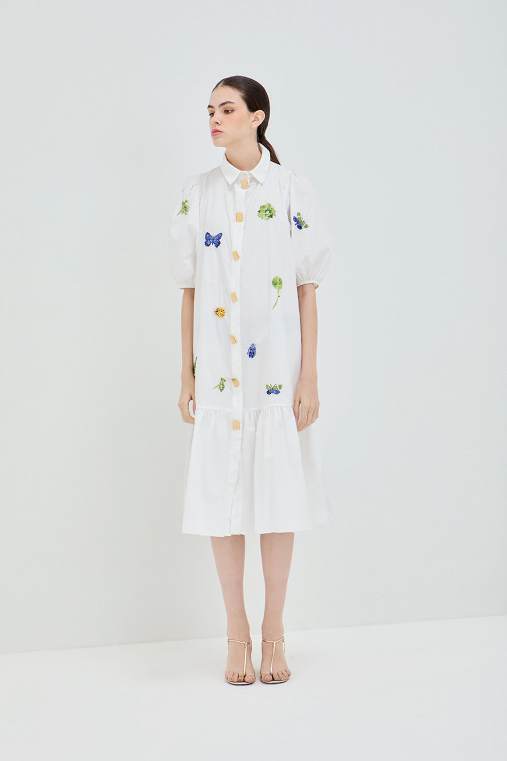 Vestido bufante babado flora bordado