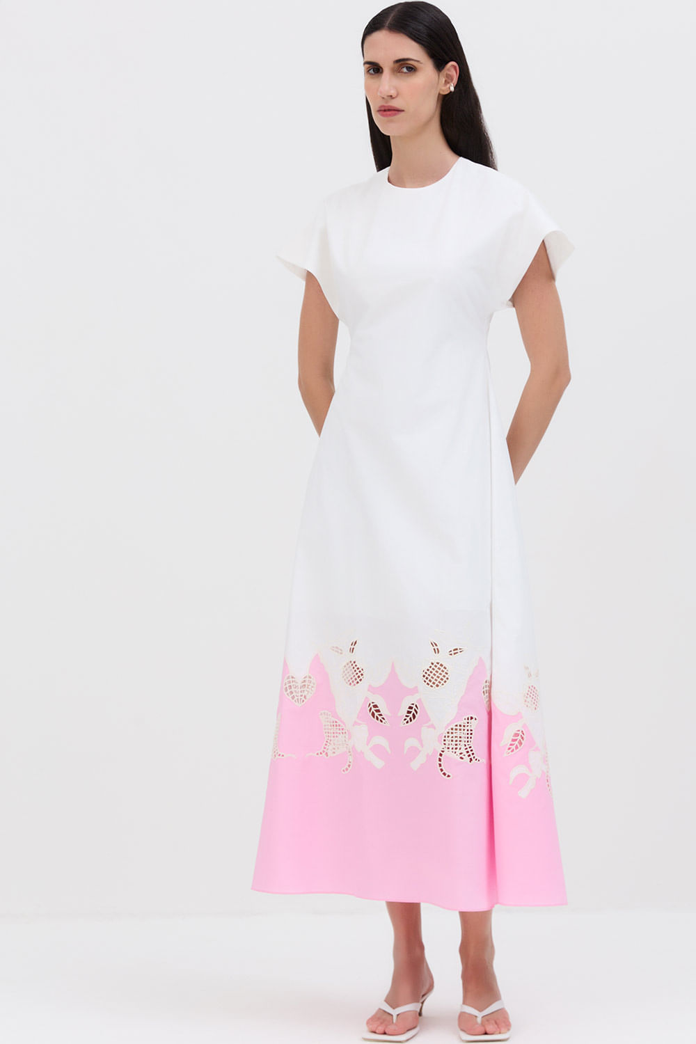 Vestido longo com mangas, decote careca e cintura marcada. Bordado em rechilieu na barra. 100% viscose.